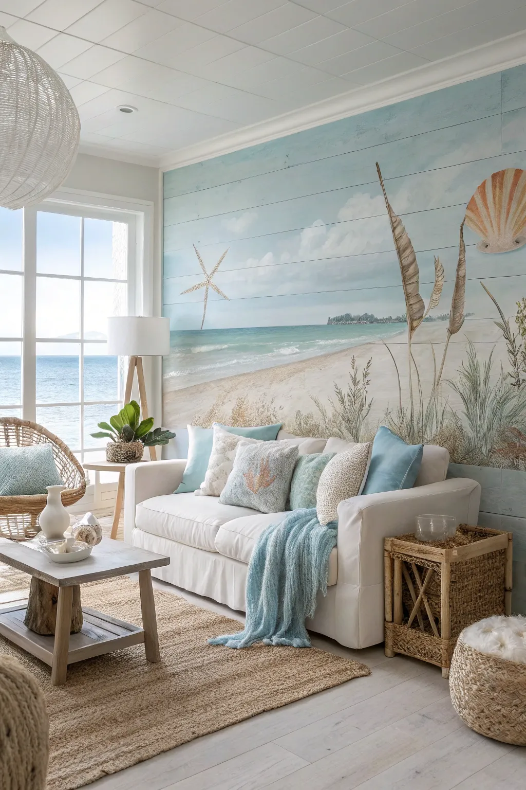 Transport the essence of the sea into your home with an coastal inspired design mural. The gentle blues and sandy hues that grace my living space effortlessly capture the serene essence of the coast.