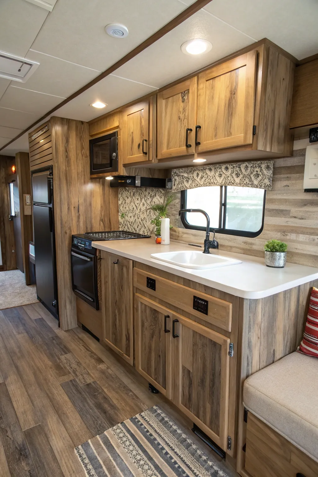 Adding timber-like textures can bring warmth and a countryside feel to your RV. I’m fond of using wood-effect tiles to imbue a natural allure without the heft of actual timber.