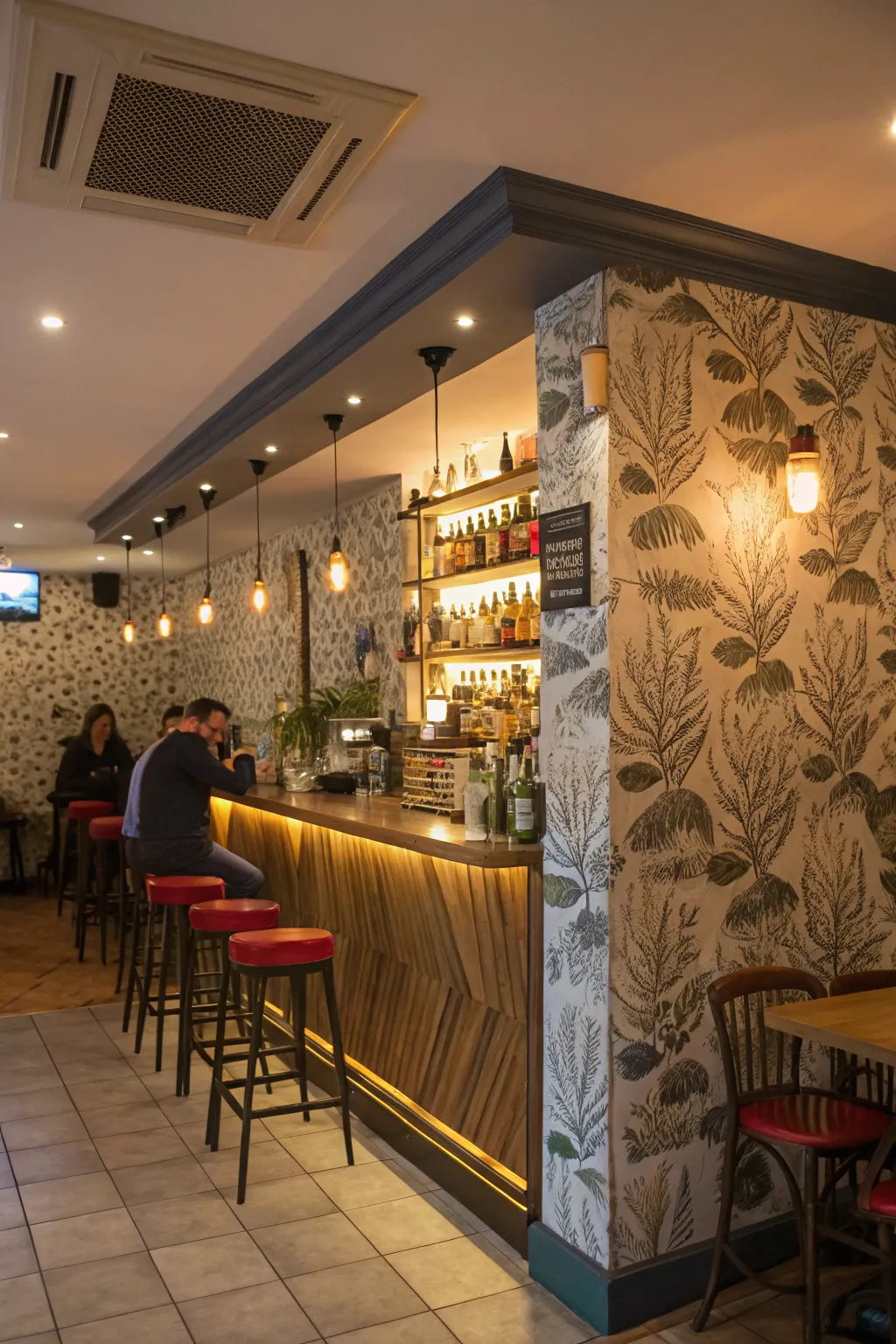 Establish a focal point with a striking feature wall, using paint or wallpaper that echoes your restaurant’s theme, making the bar memorable.