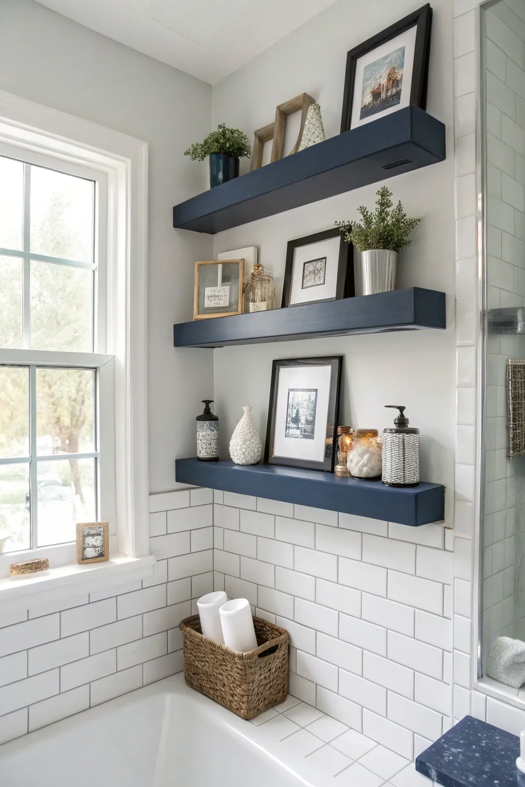 Affix suspended ledges in indigo to infuse stowage without compromising panache. They’re impeccable for showcasing exquisite toiletries or décor pieces.