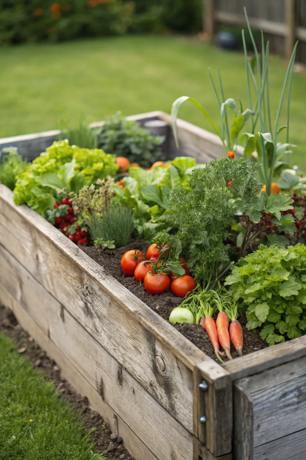Integrate your raised bed into natural surroundings by setting it amidst grass or gravel paths. This design effortlessly harmonizes with the landscape, creating a unified garden ambiance.
