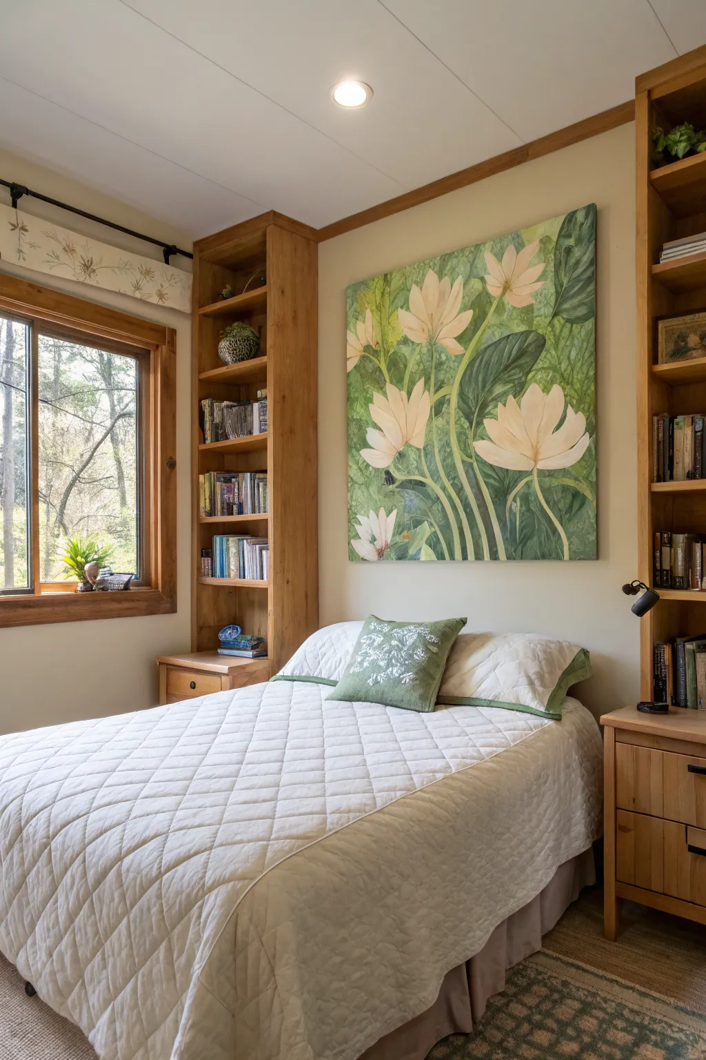 Surprise your senses with an art piece that defies expectations. Blending unexpected elements and colors can craft a unique and captivating focal point in your bedroom.