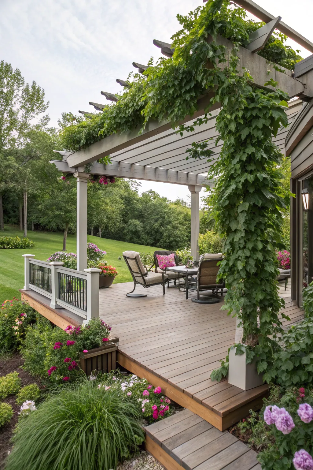 Bring the beauty of nature to your deck with potted plants and natural wood details. I’ve found that adding greenery can soften the area and create a stronger connection with its surroundings. Adding greenery can soften the space