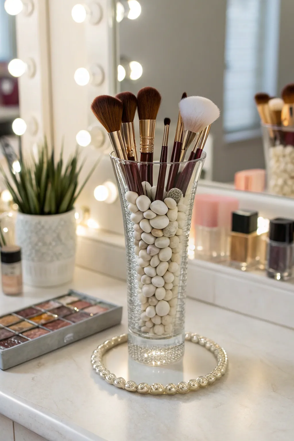 Transparent crystal containers brimming with gems or miniature stones can elevate your makeup brushes into a stunning display atop your dressing table. I often suggest this approach to patrons who treasure a hint of sophistication and desire their brushes to be readily available. Elegance meets efficiency!