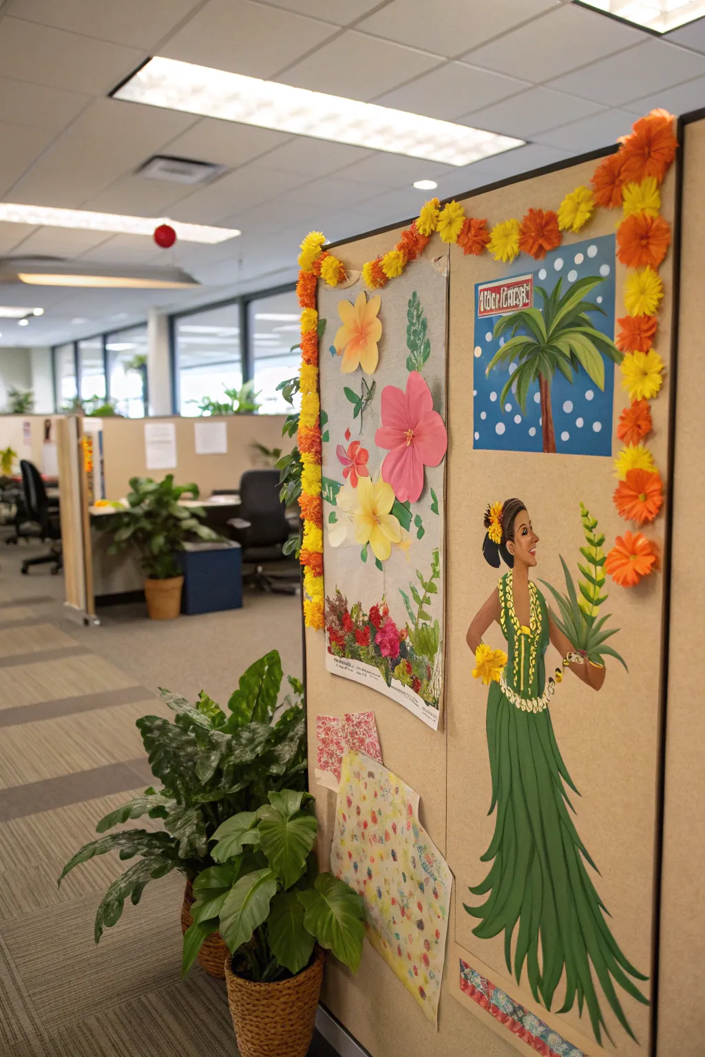 Convert your workplace into an exotic island retreat using a display board adorned with images of swaying palms, rolling ocean waves, and bright sunshine. I once utilized this theme for a client’s office, and it immediately improved everyone’s mood.