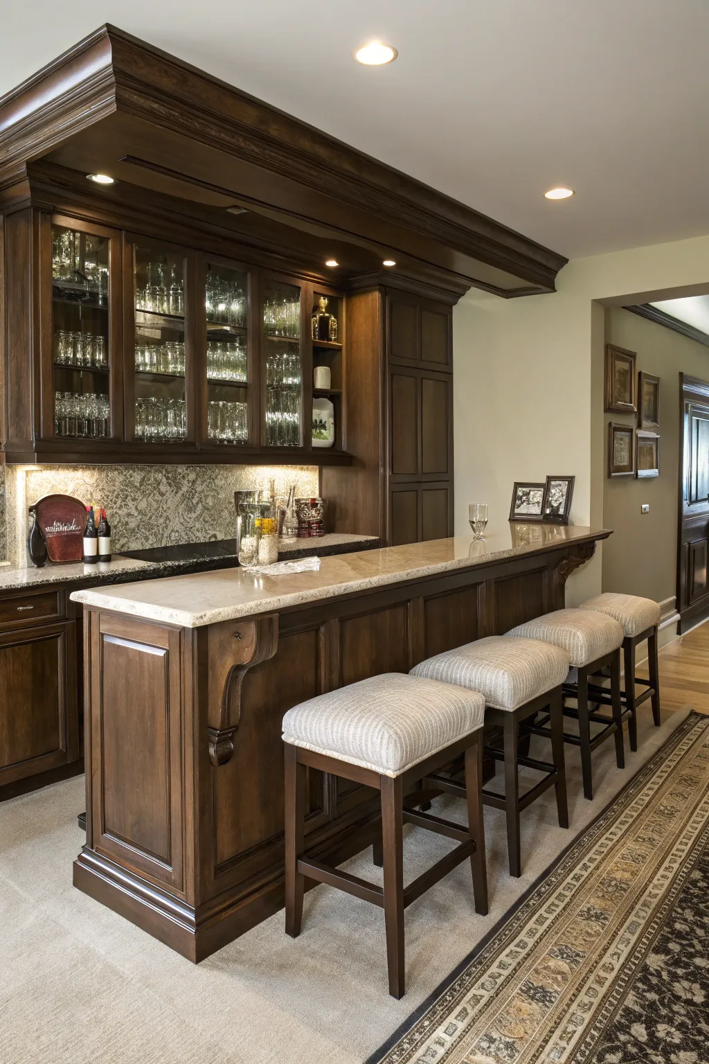 Reflect upon the assimilation of inherent seating within your bar configuration, thereby engendering a welcoming and pragmatic enhancement. It constitutes a remarkable approach to fashioning a societal epicenter within the culinary precinct.