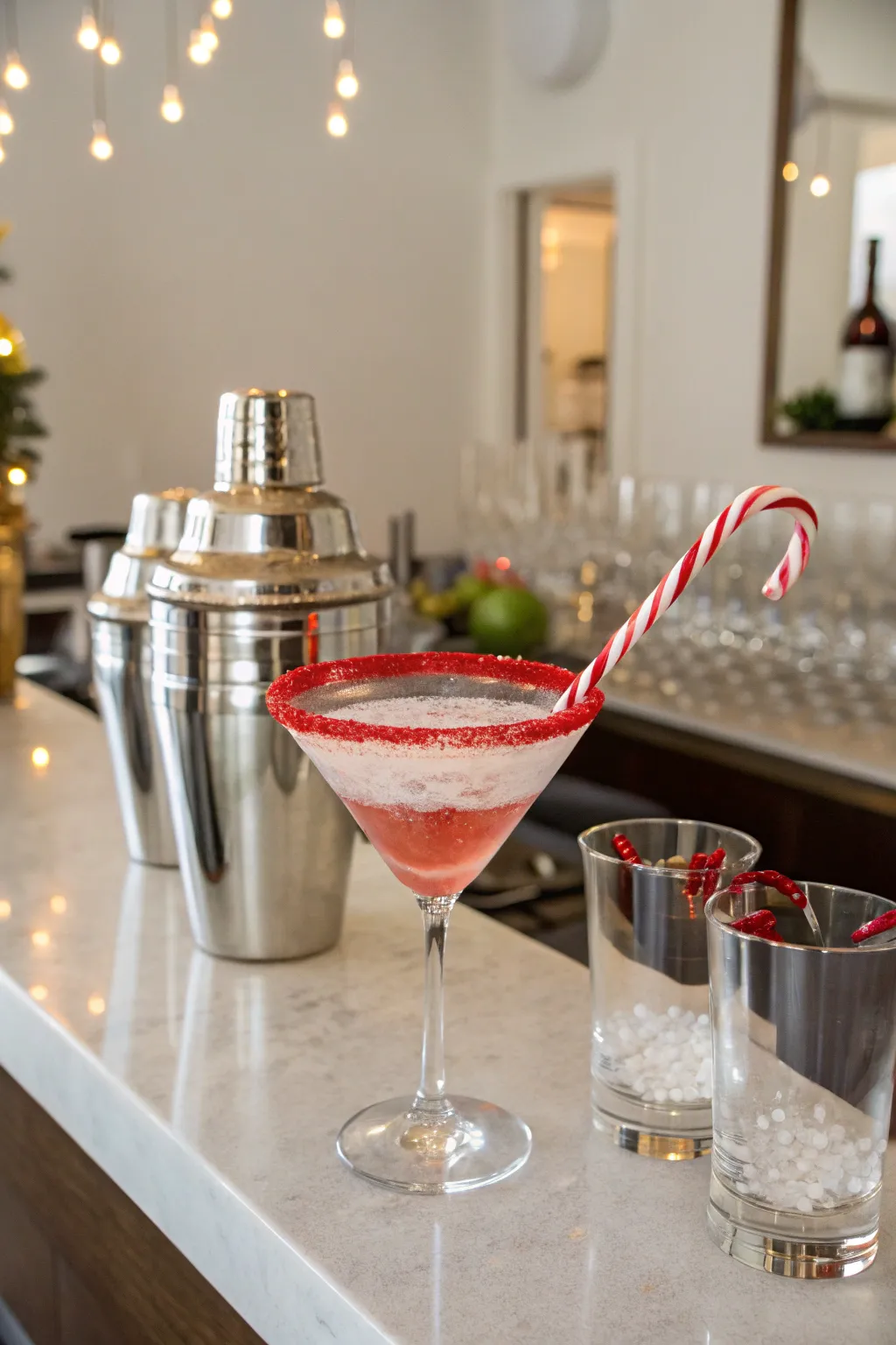 Enhance ambiance using strand lights designed as peppermint candies. I adore how they cast a cozy shine across the party area.