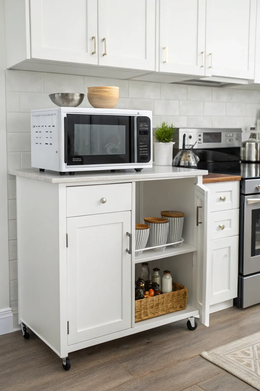 - Wheeled Microwave and Coffee Station: Make the most of your space by combining your microwave and coffee must-haves in one chic, mobile station.
