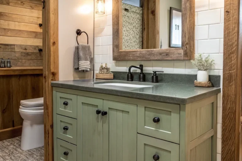 The timeless appeal of sage green brings a peaceful ambiance to any bathroom. Let’s uncover inventive ways to feature a sage green vanity in your space, crafting a comforting haven. Incorporate Metal Ornaments An elegant bathroom with metallic accents that enhance a sage green vanity. Metallic accents like gold or silver can add sophistication to a sage green bathroom. These elements create striking focal points without overpowering the space. A few relevant products: Gilded Bathroom…