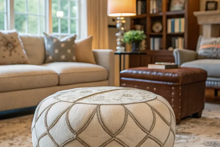 In any family room, ottomans provide a wonderful accent, combining style with practicality. Whether you’re seeking additional seating or a comfortable place to put your feet up, I have some wonderful suggestions to share! Layered Textures Using a fabric ottoman and leather accents to layer textures. Combine various materials for your ottoman to give your living room more depth and appeal. Personally, I love the contrast between a supple fabric ottoman and a sleek leather…