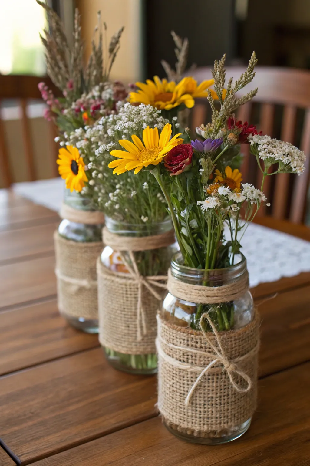 For a country style, pack quart containers with wildflowers and encircle them with tough fabric and strands. I frequently employ this arrangement during the autumn season, and it invariably infuses that snug, rural ambiance into my dwelling.