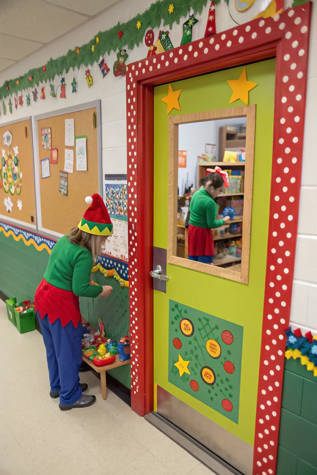 Illuminate your classroom portal with a door enshrouded in vibrant holiday luminaries. This cheerful design imparted a celebratory gleam that proved irresistible.