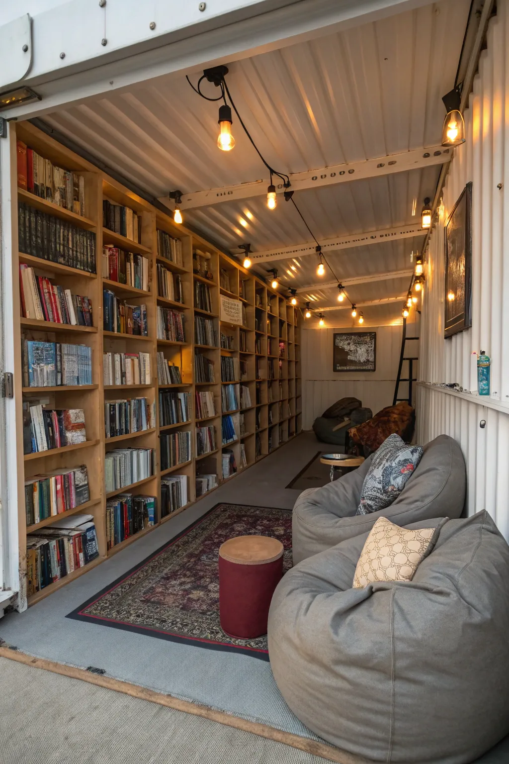 Change the container to become a library or a comfy nook to read in. I have always yearned to get a serene spot that features filled bookshelves and comfortable spots to sit, since I love books.