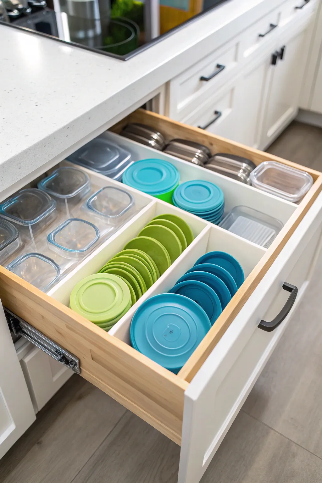 Drawer dividers are essential for keeping lids and containers distinct. This setup keeps everything organized and easily accessible.