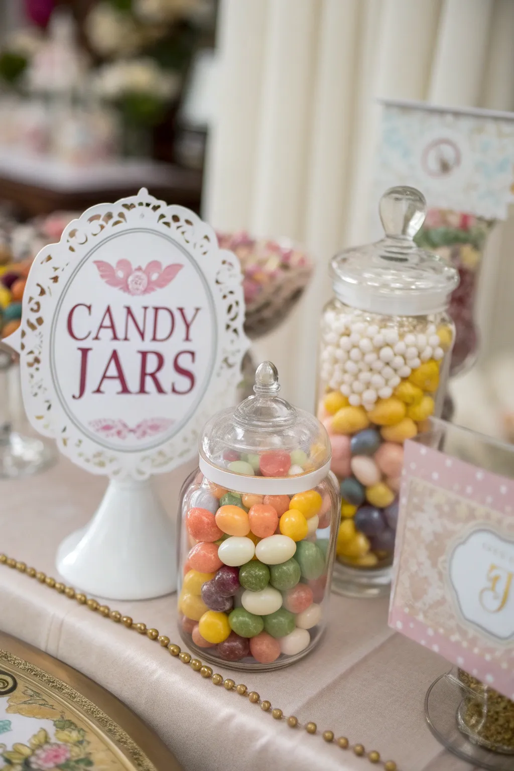 • Apothecary glass containers: Enhance charm with apothecary glass containers, perfect for showcasing colorful candies elegantly.