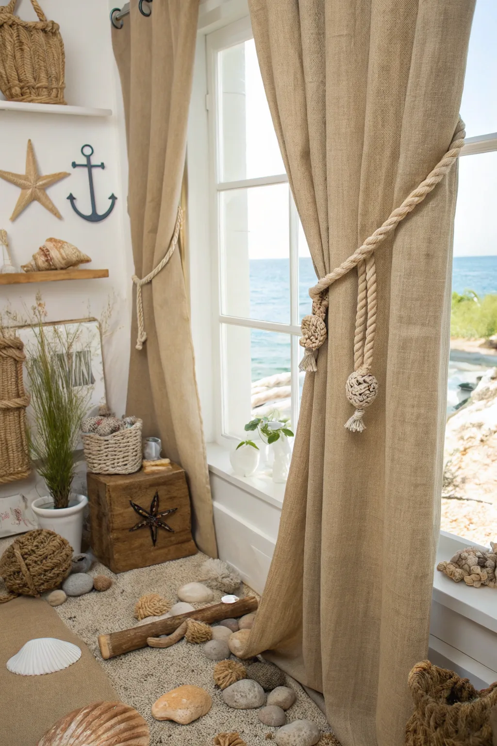 Sackcloth drapes with nautical accents evoke coastal vibes.