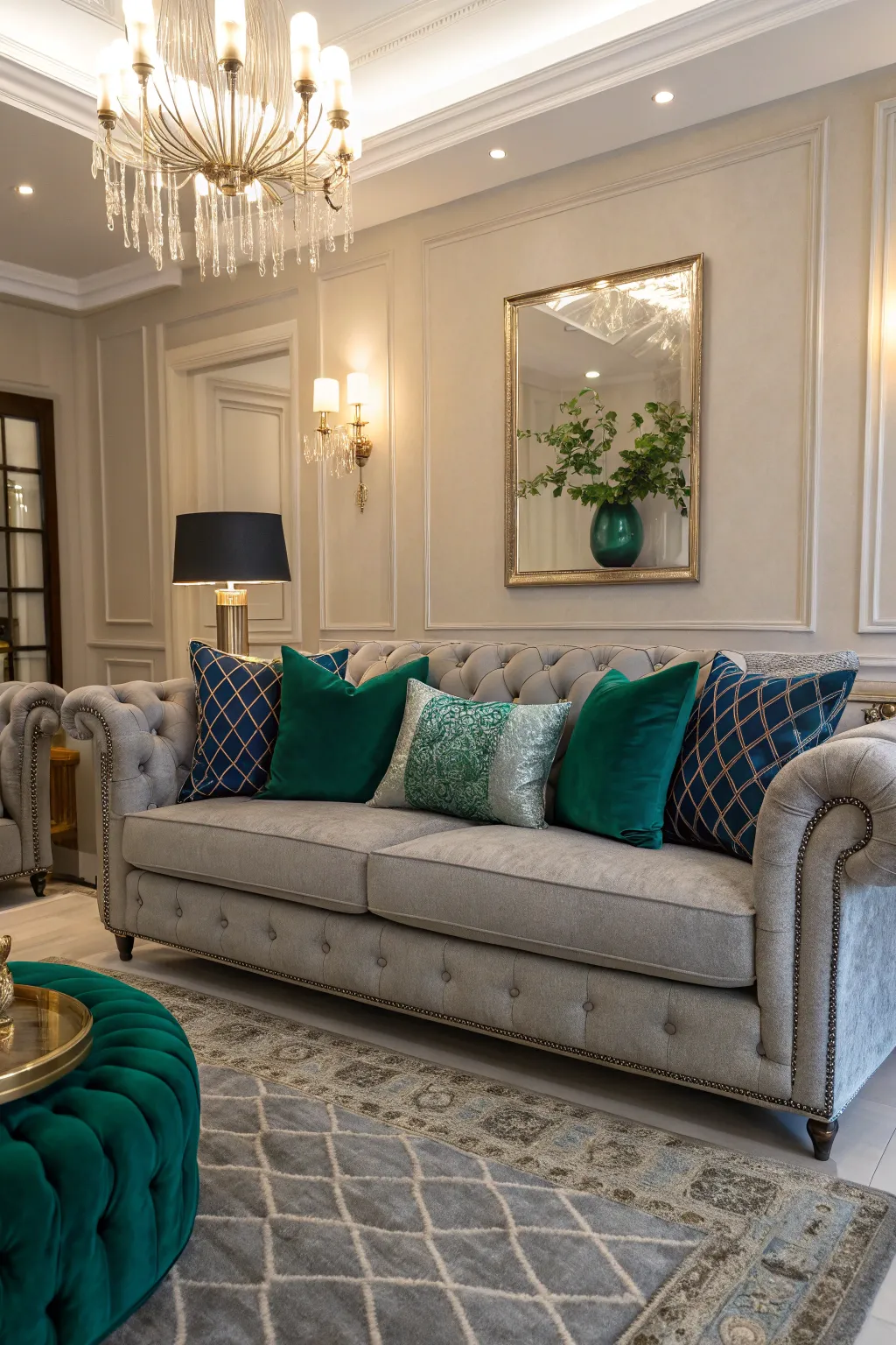 - Sapphire Blue Silk Ornamental Pillow: Improve sophistication with silk pillows that contrast beautifully on a grey sofa.