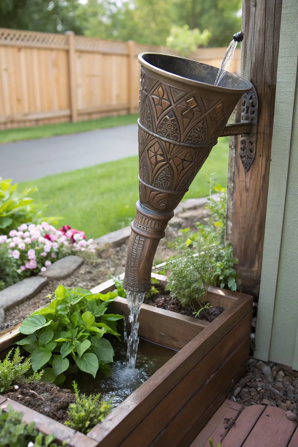 Incorporate a chic rainwater holder to gather water from your downspout. It’s an eco-conscious option that can be practical and visually pleasing. I cherish the rustic charm it introduces.