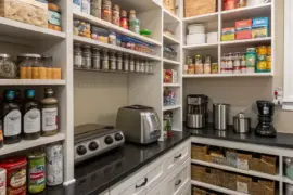 Employ sunny highlights on open shelving to capture visual interest. I truly enjoy adorning shelves with yellow containers and flower holders for a subtle yet chic dash of color.