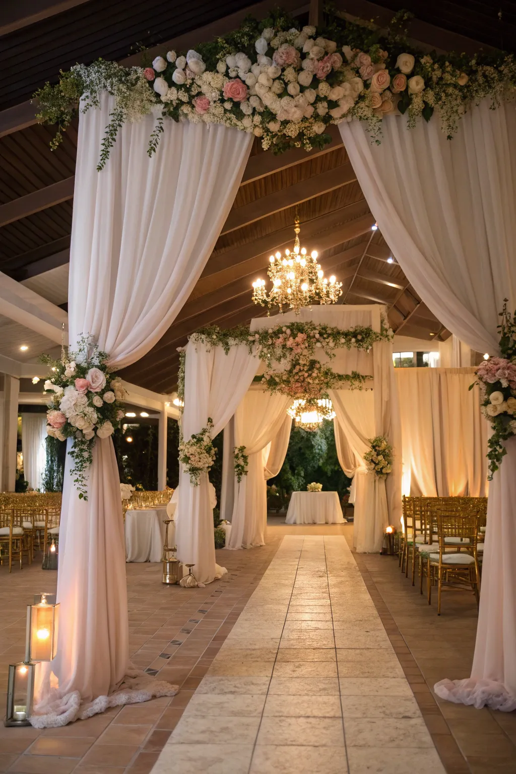 Combine drapery with drifting florals for an ethereal effect. This crafts an immersive encounter that’s as unforgettable as it is beautiful.