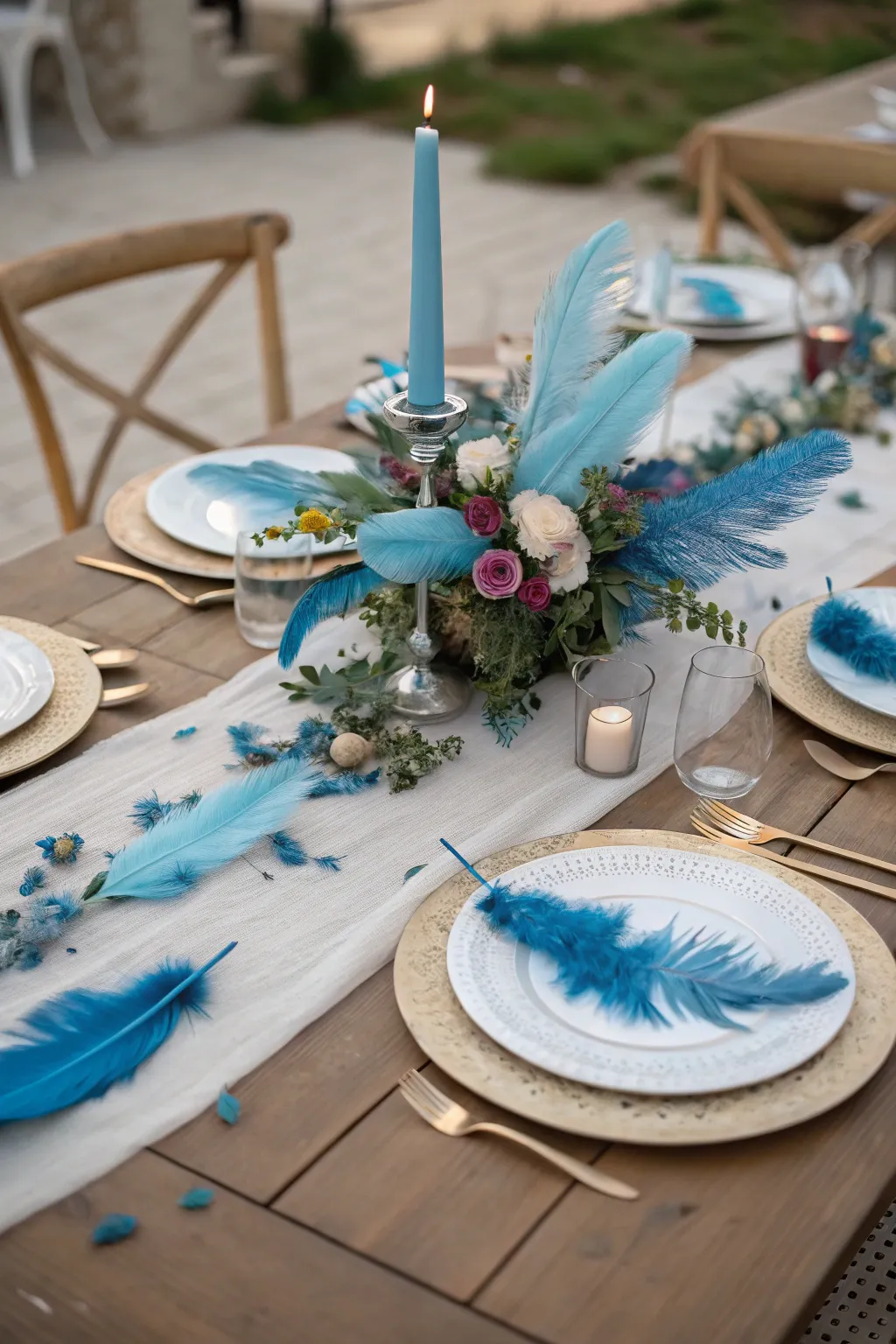 Dare to be different by featuring blue feathers or quirky decorations in your centerpiece. It’s an instant conversation starter, adding a touch of personality and whimsy to your table.
