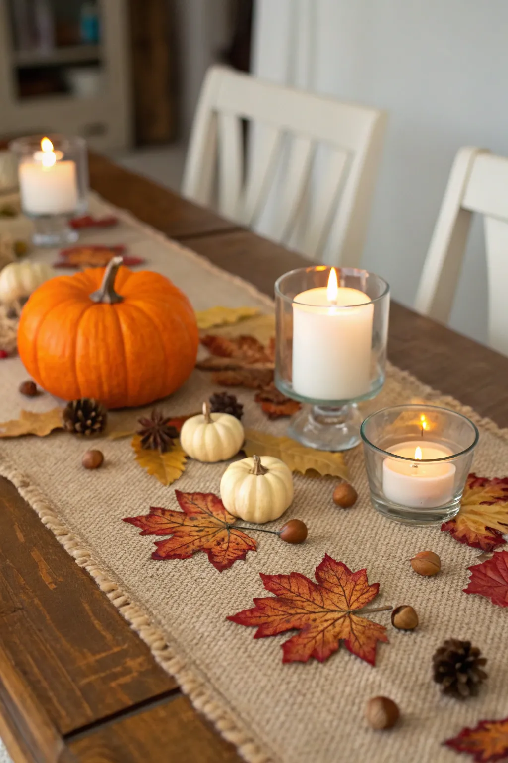 Beautify your dining table with a seasonal table covering and a display of miniature gourds and wax lights. It’s a simple method to incorporate a hint of fall into every meal.