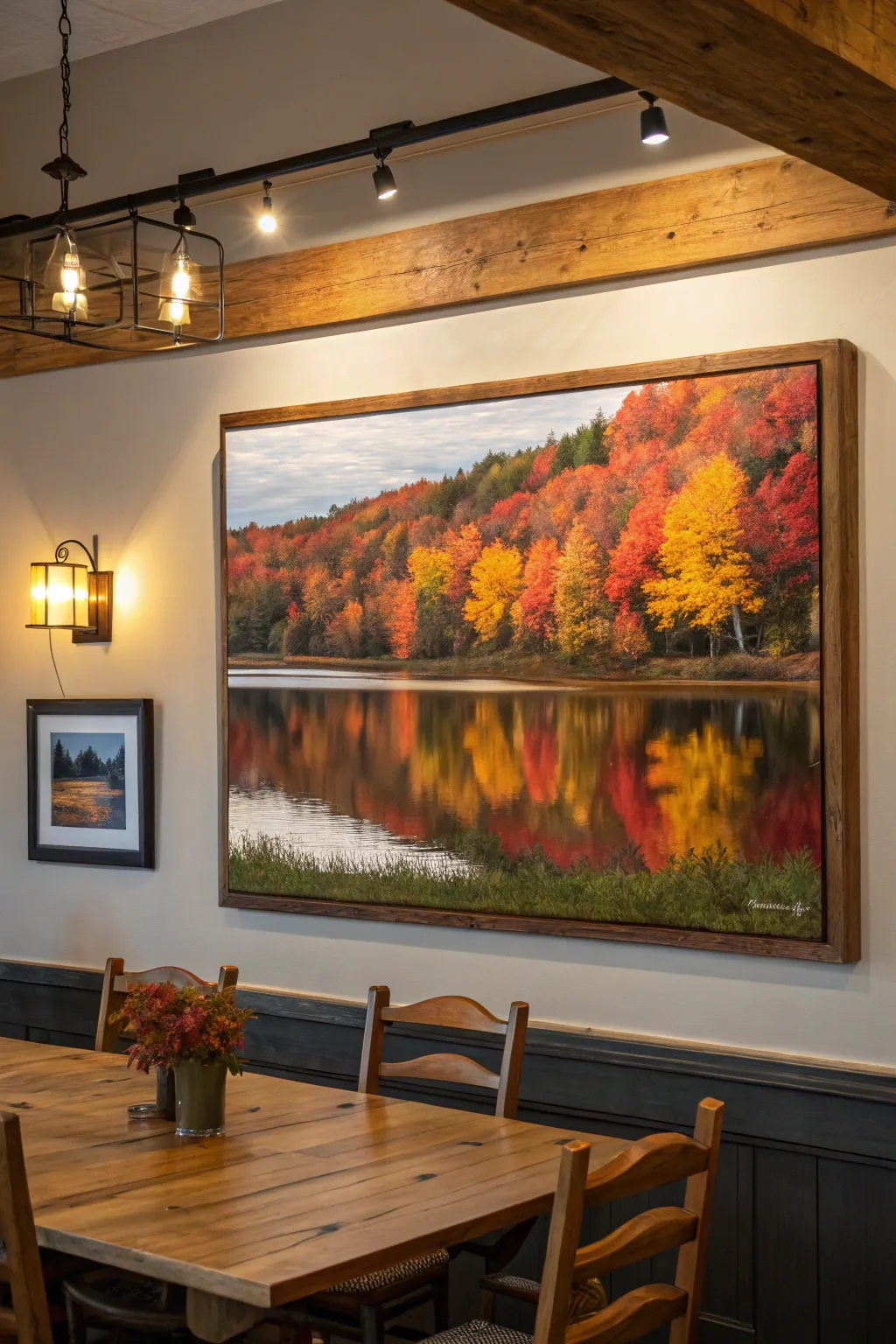 Encapsulate the tranquility of a lake mirroring autumn hues for a soothing effect. This artwork is a favored addition to dining areas, offering a serene vista that enriches mealtime gatherings.