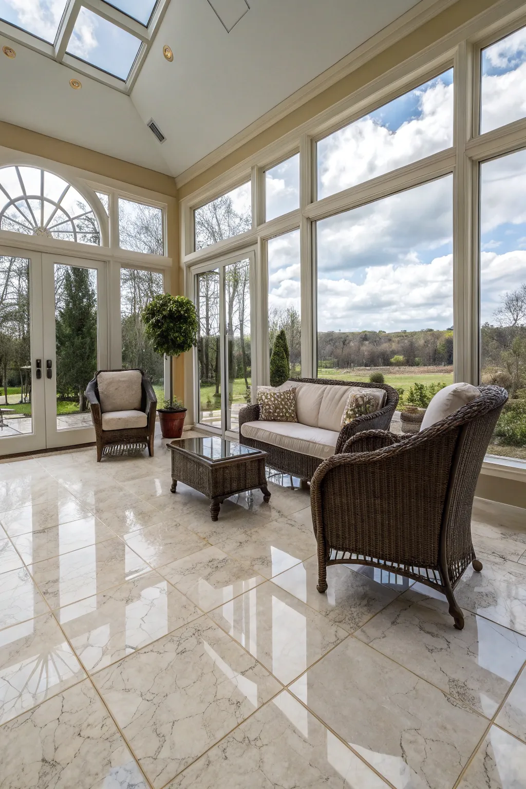 A luxurious sunroom featuring porcelain tile flooring.