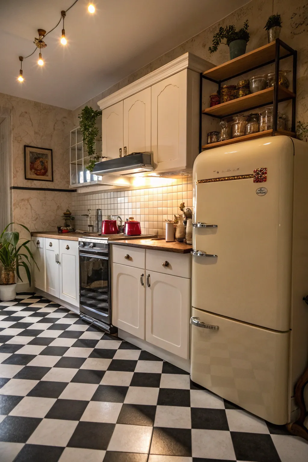 There is an enduring charm to a black and white checkerboard tile floor. I am captivated by the way it instantly enhances a kitchen, infusing a retro vibe that is both refined and lively.