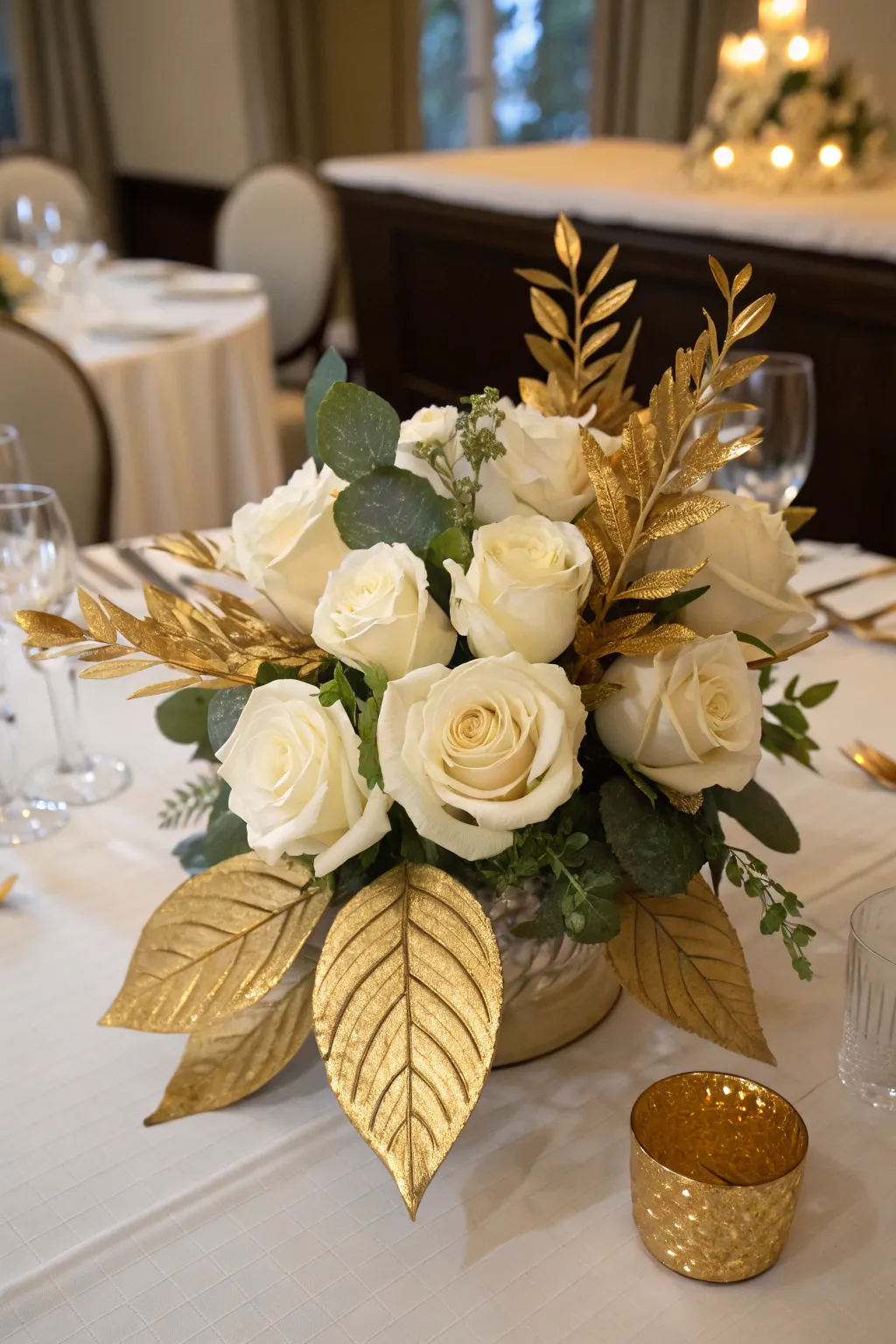 Pair white blooms with gold-spritzed foliage for a breathtaking centerpiece. From timeless roses to modern bunny tails, these arrangements are guaranteed to capture everyone’s gaze.