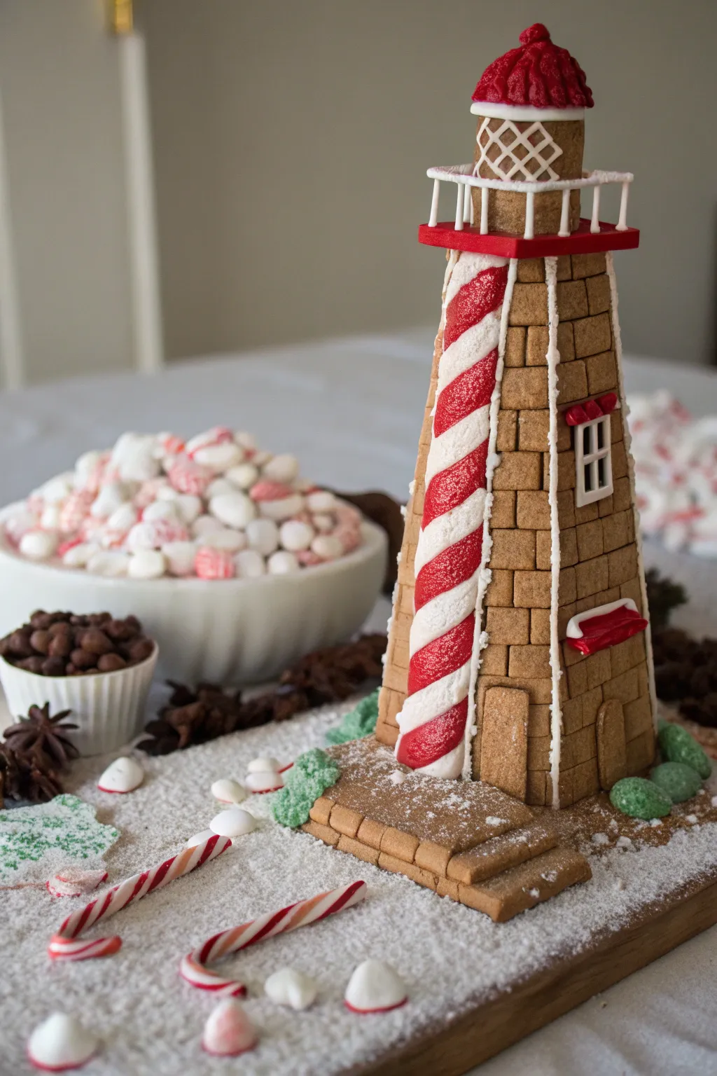 Erect a gingerbread beacon with striped glaze and sweet pebbles. The nautical theme is a fondness of mine, particularly when appending a sweet sailboat nearby.