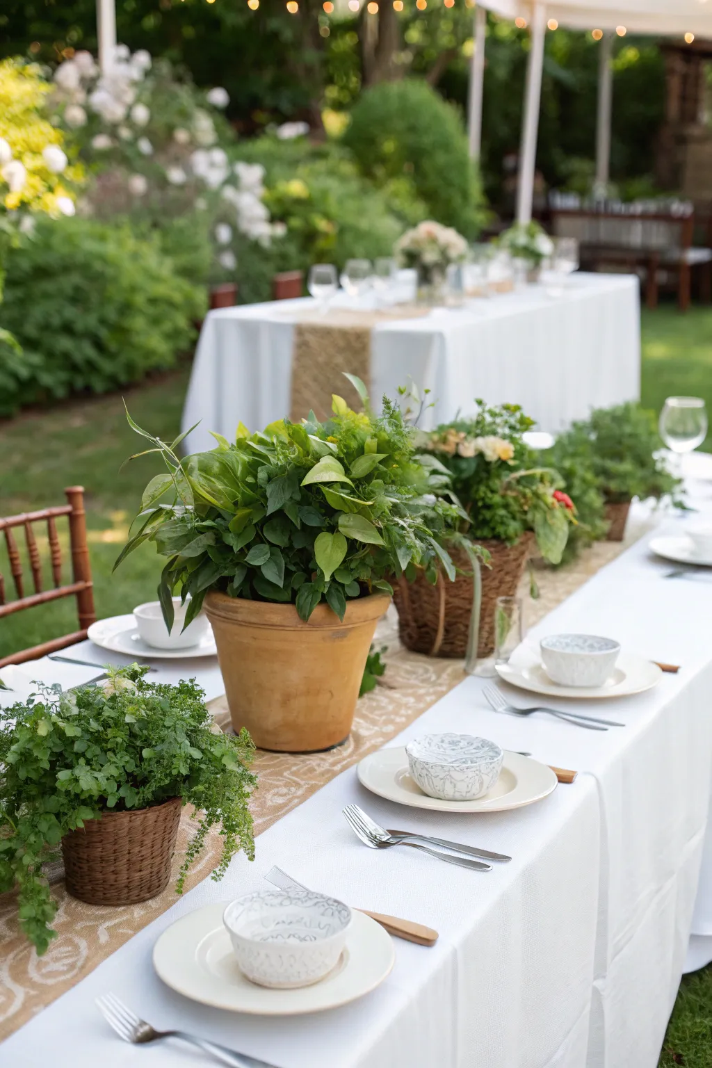 Eco-friendly potted plants serve as beautiful table centerpieces.