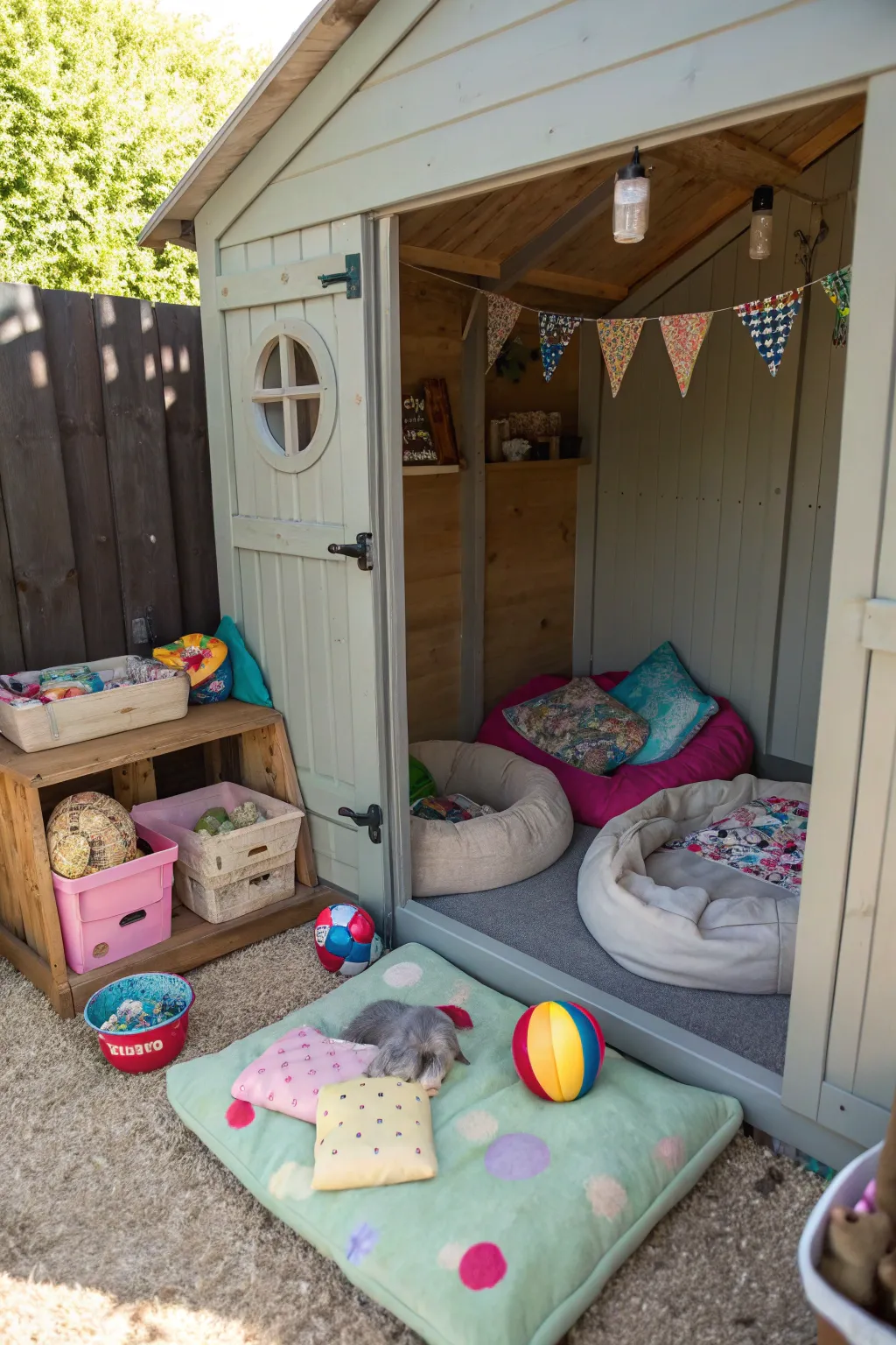 Create a pet-friendly area with comfortable beds and playthings. My pets adore their personal area in the shed where they can relax and have fun.