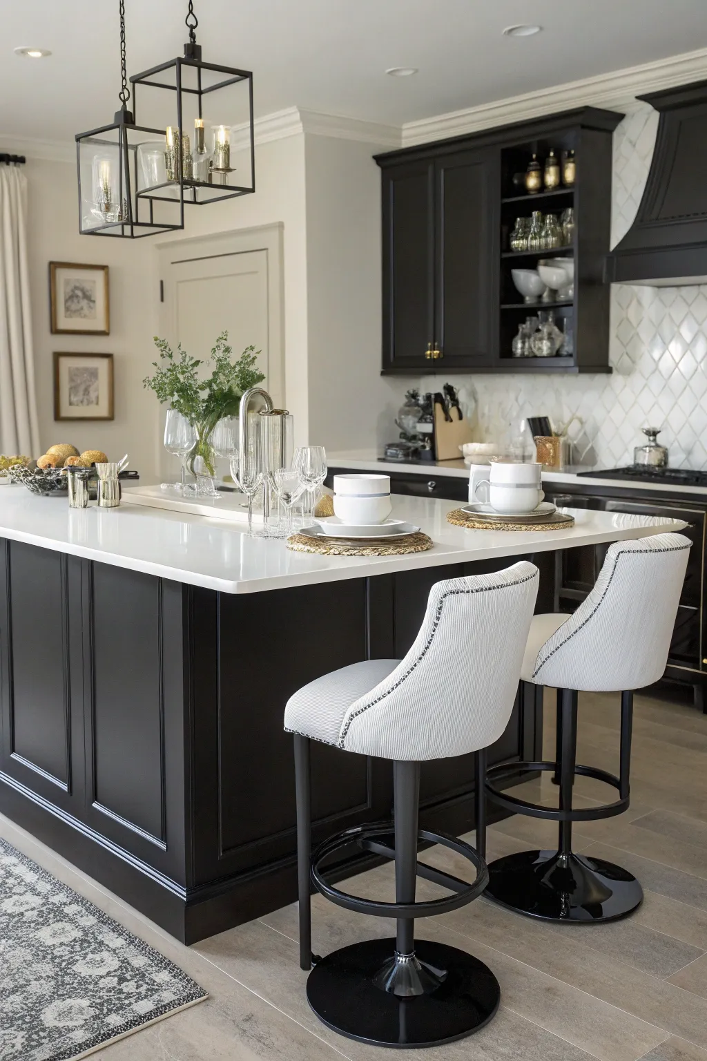 • Two-Tone Seating: Elevate your island seating using stylish black and white stools for a perfect contrast.