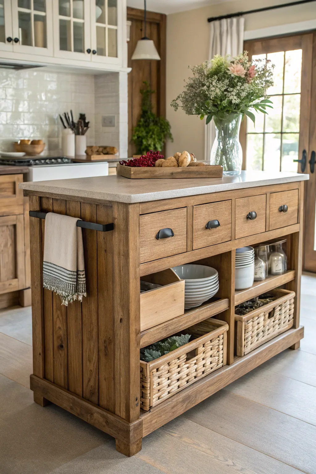 - Country Wicker Vessels: Enliven your kitchen island with country wicker vessels for a cozy farmhouse feel.