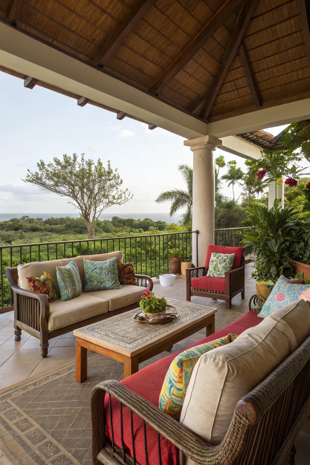 Integrate tropical plants like palms or hibiscus to lend your lanai a rich, exotic atmosphere. They flourish well in the filtered sunlight of a lanai.