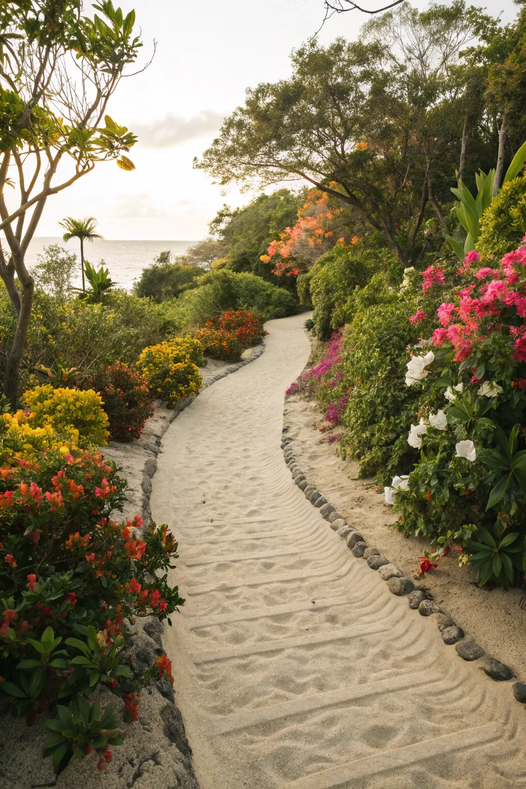 For a countryside vibe, think about walkways made of sand that weave through your garden. Not only are they beautiful, but they also feel great under your feet, perfect for relaxed walks.