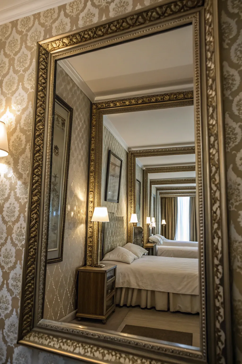 Layer mirrors over wallpaper to create a visually appealing effect. This combination enhances the depth and dimension of your bedroom, for a distinctive and tailored aesthetic.