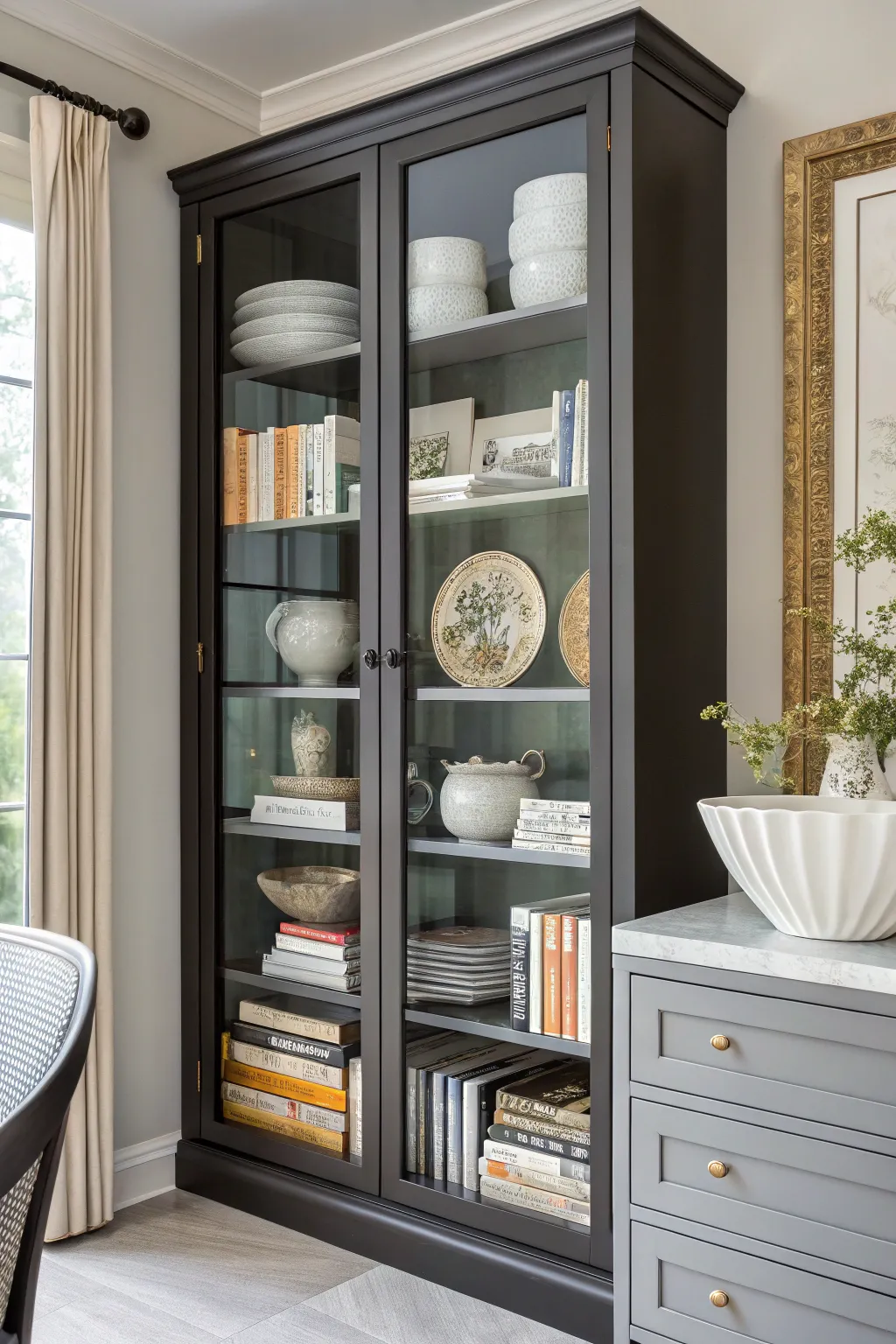 Position a mirror along the back surface of the cabinet to achieve the effect of increased space and greater light reflection. This tactic is one I utilize to create a sensation of spaciousness in any given area.