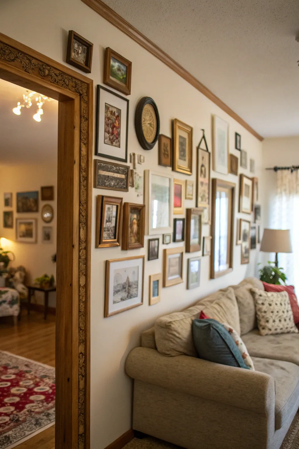 Design a personalized display wall by showcasing an array of framed artwork, snapshots, and reflective surfaces. In my cozy Brooklyn apartment, this aesthetic brings an intimate, inviting atmosphere to the area.