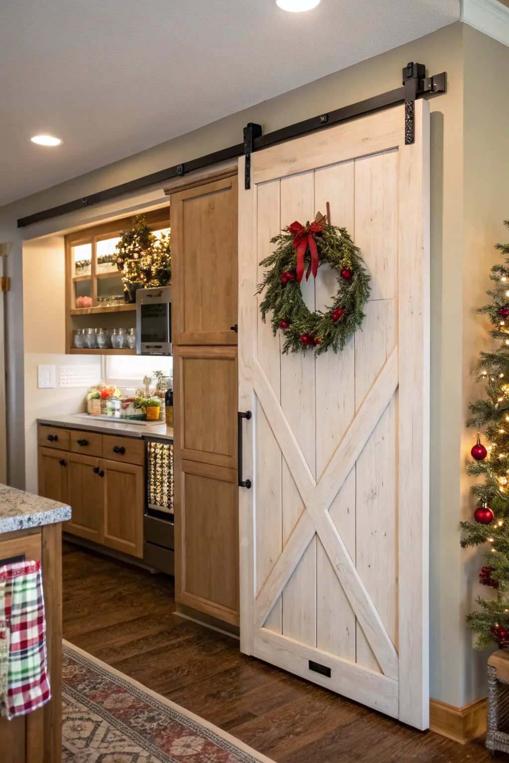 A kitchen showcasing a sliding barn door pantry, ornamented with a seasonal wreath.