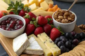 Prepare a countryside spread presentation with cheeses and fruits for an easygoing yet refined element. I favor arranging these assortments on wood surfaces for a relaxed ambiance.
