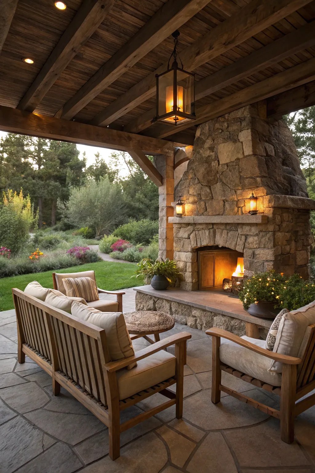An open-air blaze pit or hearth acts as an inviting centerpiece. I’ve fashioned patios where a stone hearth takes center stage, offering warmth and uniting friends and family during chilly evenings.