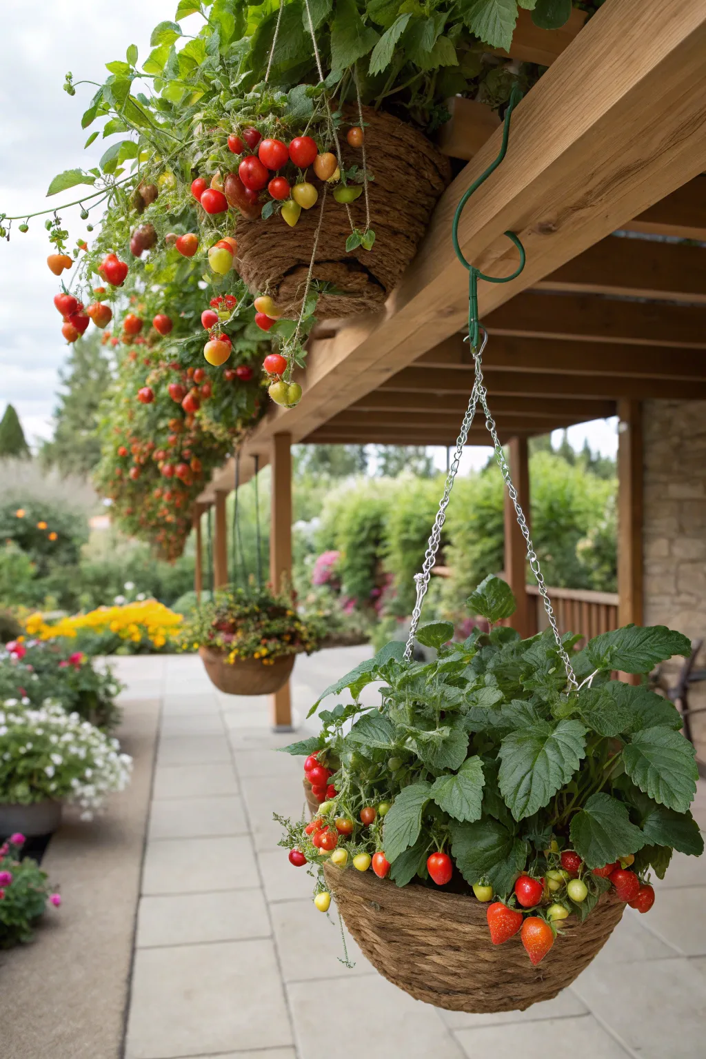 Get the most out of your space using hanging baskets for trailing plant types such as cherry tomatoes or strawberries. My patio feels just like a cozy, leafy getaway, with these dangling gardens swaying gently in the breeze.
