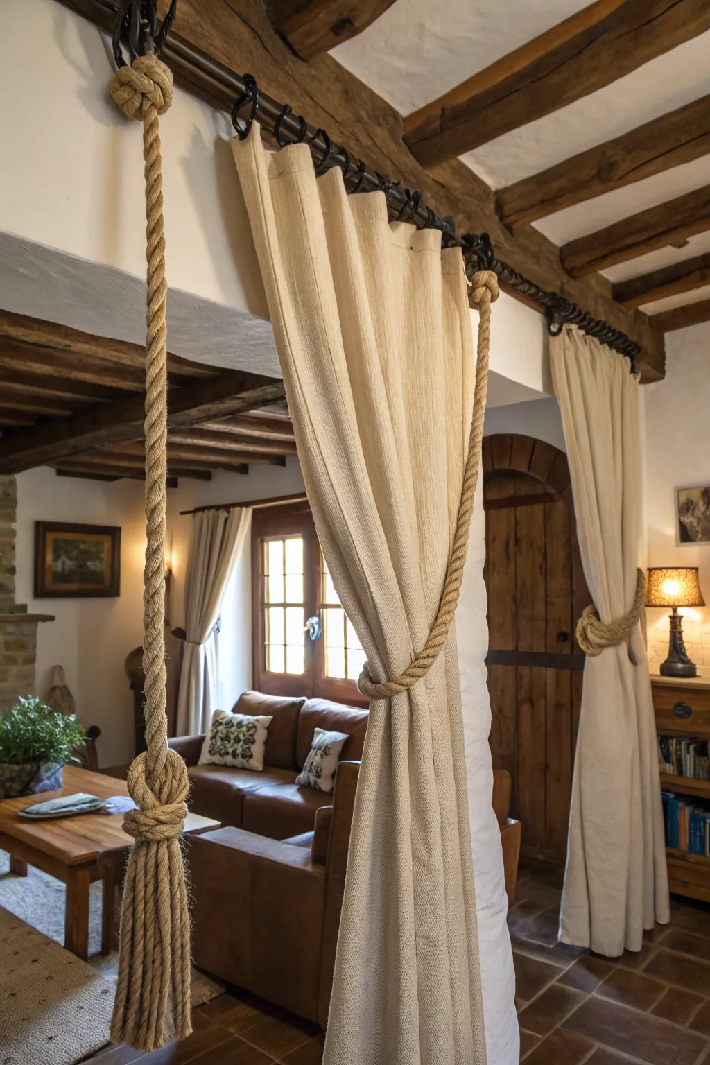 For a natural touch, use thick rope to suspend curtains. I’ve tried this in my cabin-inspired living space, and it adds a cozy, outdoorsy feel.