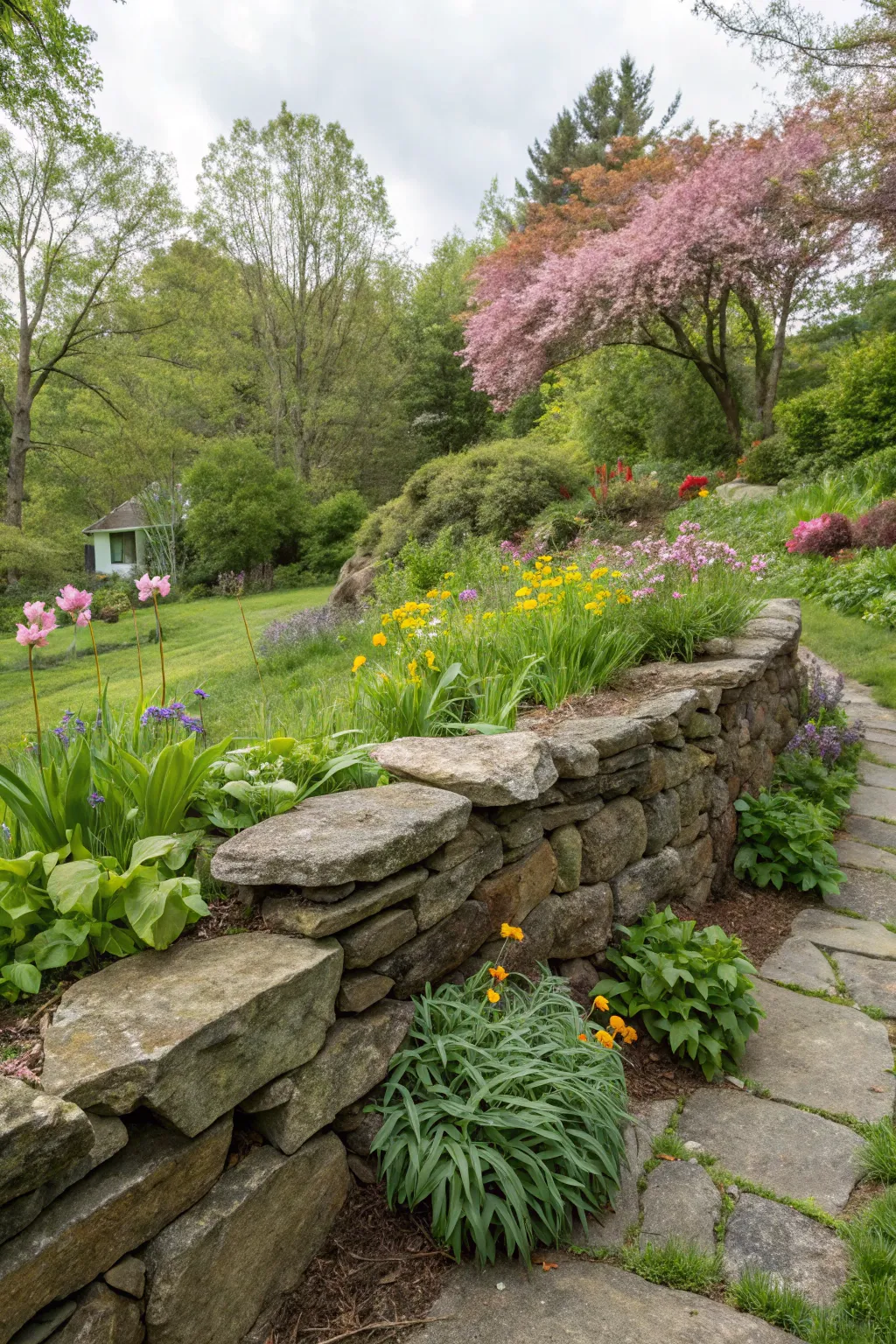 Employing tiered walls can revolutionize a sloped space into a garden brimming with life on many levels. I take joy in planting herbs and blossoms on each tier, building gradients of color and scent.