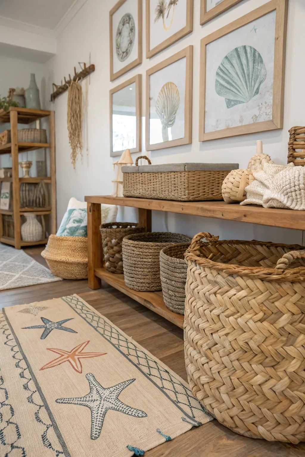 Incorporate knitted baskets or rugs to imitate the rich textures found on the beach. This is a technique I use to enhance depth and intrigue.
