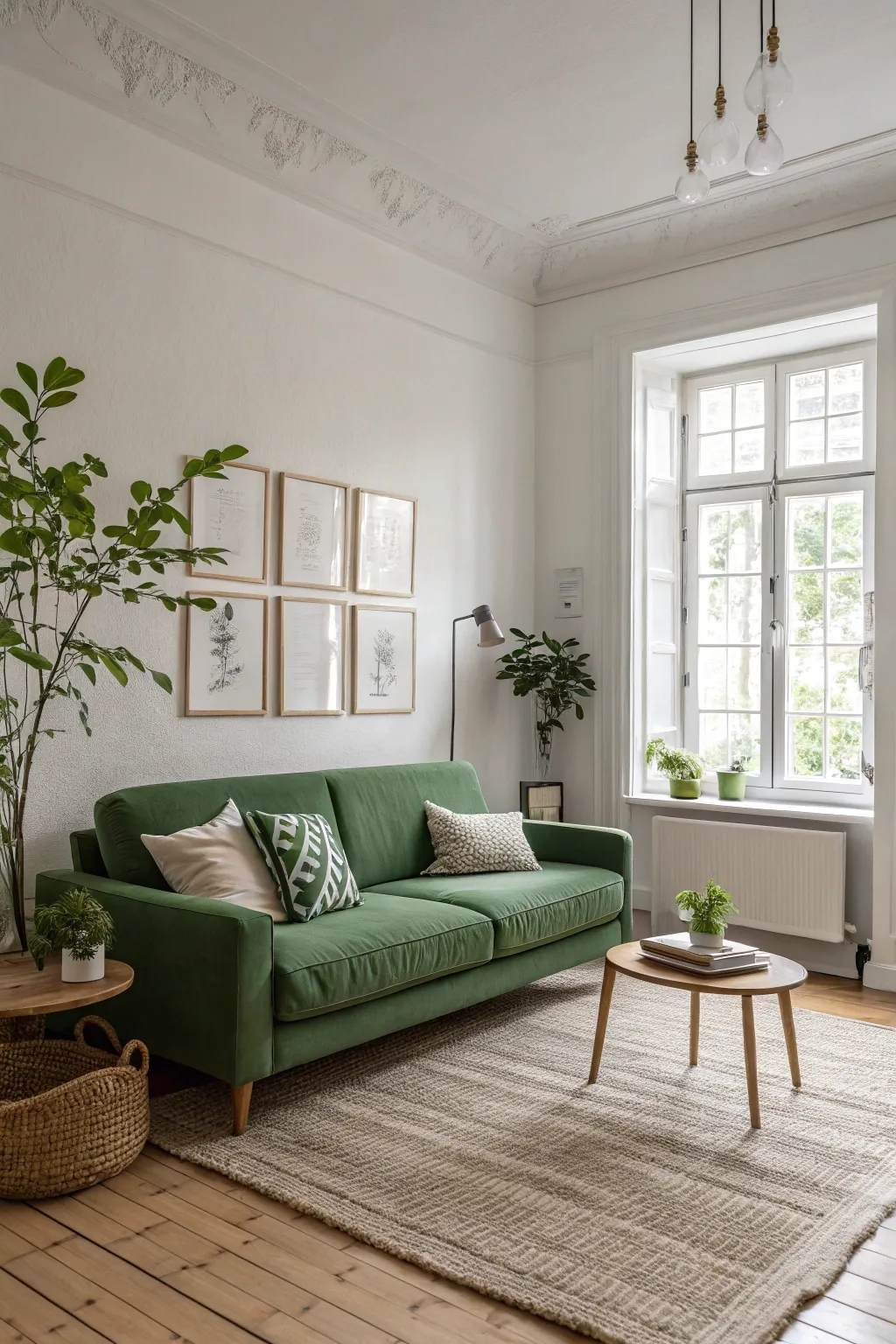 Embrace Nordic layout by pairing your green couch with minimalist decor and organic light. I appreciate how this combination fashions a serene and uncluttered area.