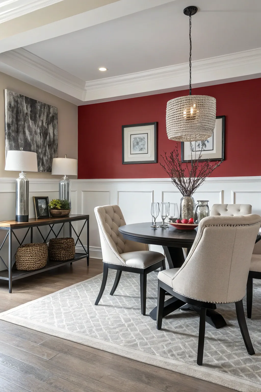 A daring color beneath the chair rail results in an impactful and modern ambiance.