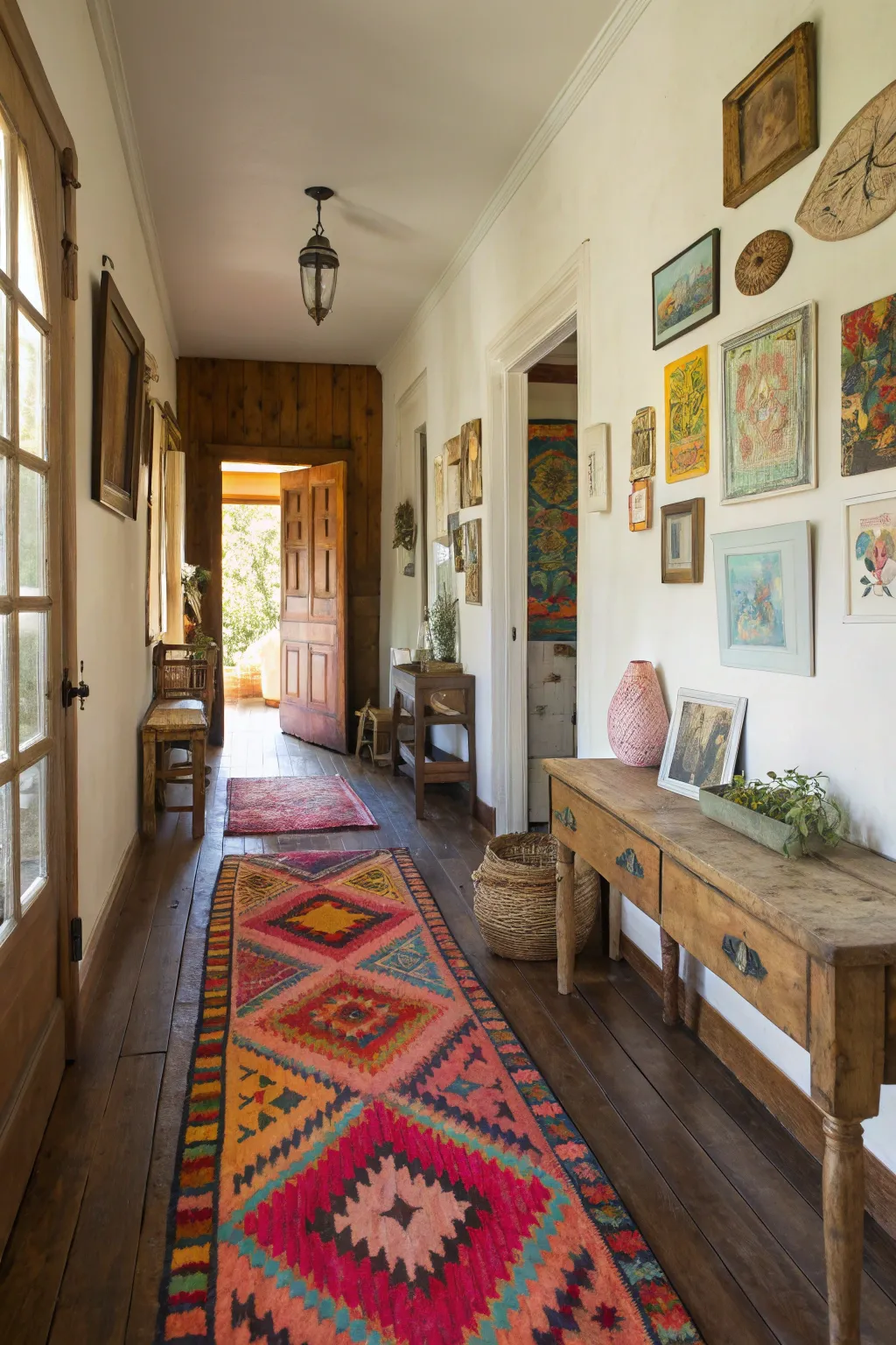 • Colorful Bohemian Area Rug: Add bohemian flair with a colorful rug that easily improves your farmhouse look.